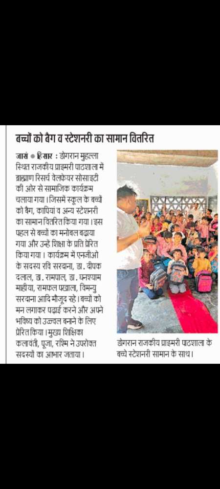 Brahma Research and Educational Welfare Society membrs, Yesterday Donates School Bags to Primary School Students at Hisar