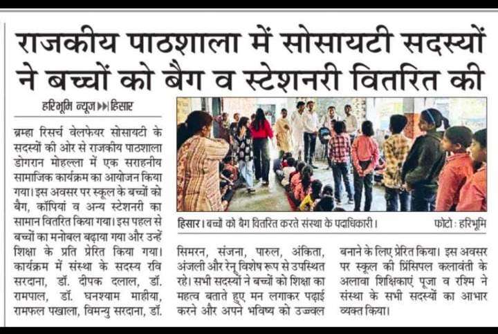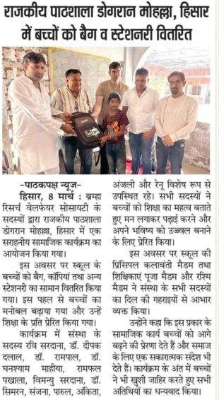 School Bag and Stationary items were donated by Brahma Research and Educational Welfare Society members at Dogran Mohalla, Hisar